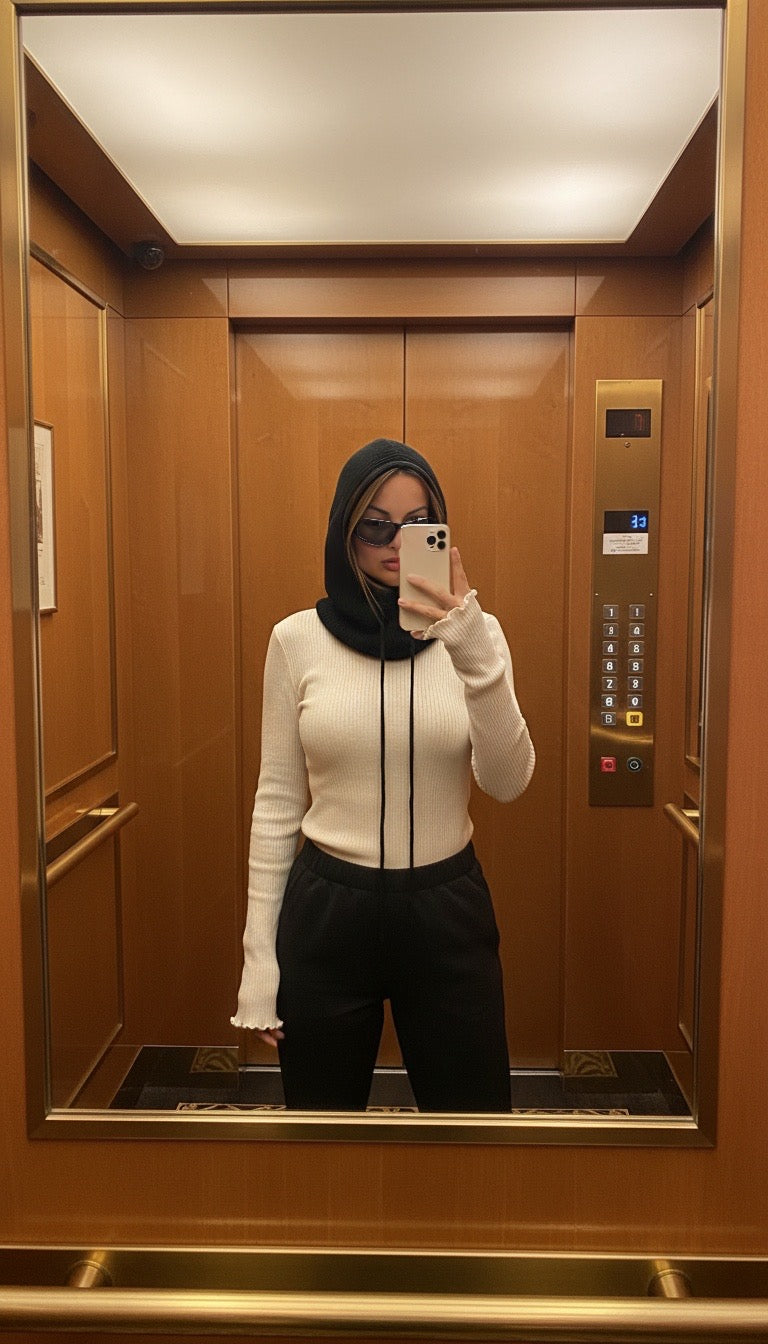 Cagoule en maille douce côtelée. Modèle avec finition autour de l'ouverture. Lien de resserrage.